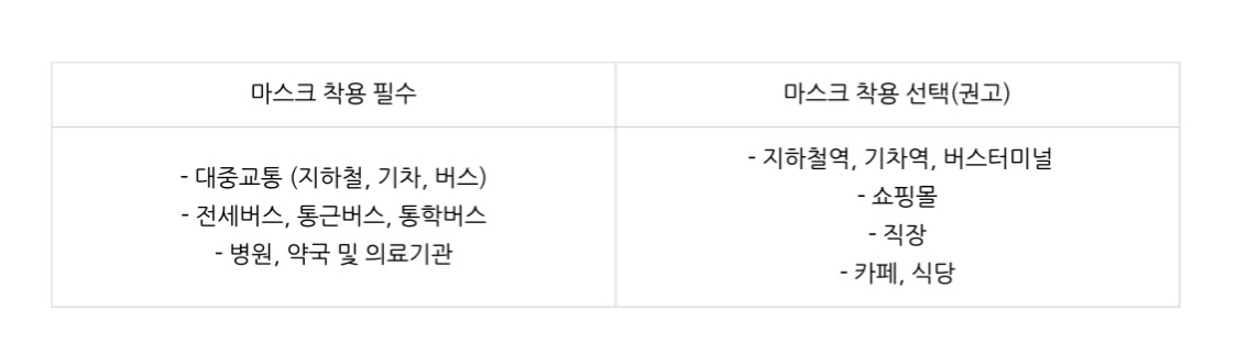 감염취약시설, 의료기관, 약국, 및 대중교통 수단에서는 마스크 착용 의무가 유지됩니다!