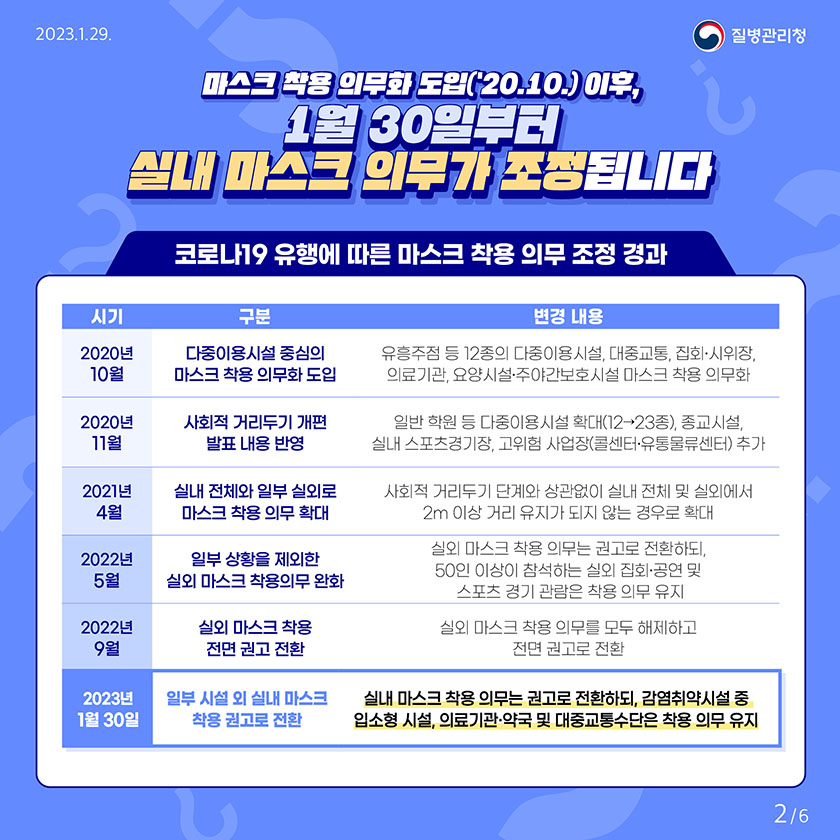 올해 1월 30일에 실내 마스크 착용 의무가 시설마다 의무와 권고로 나뉘어 하향 조정되면서
